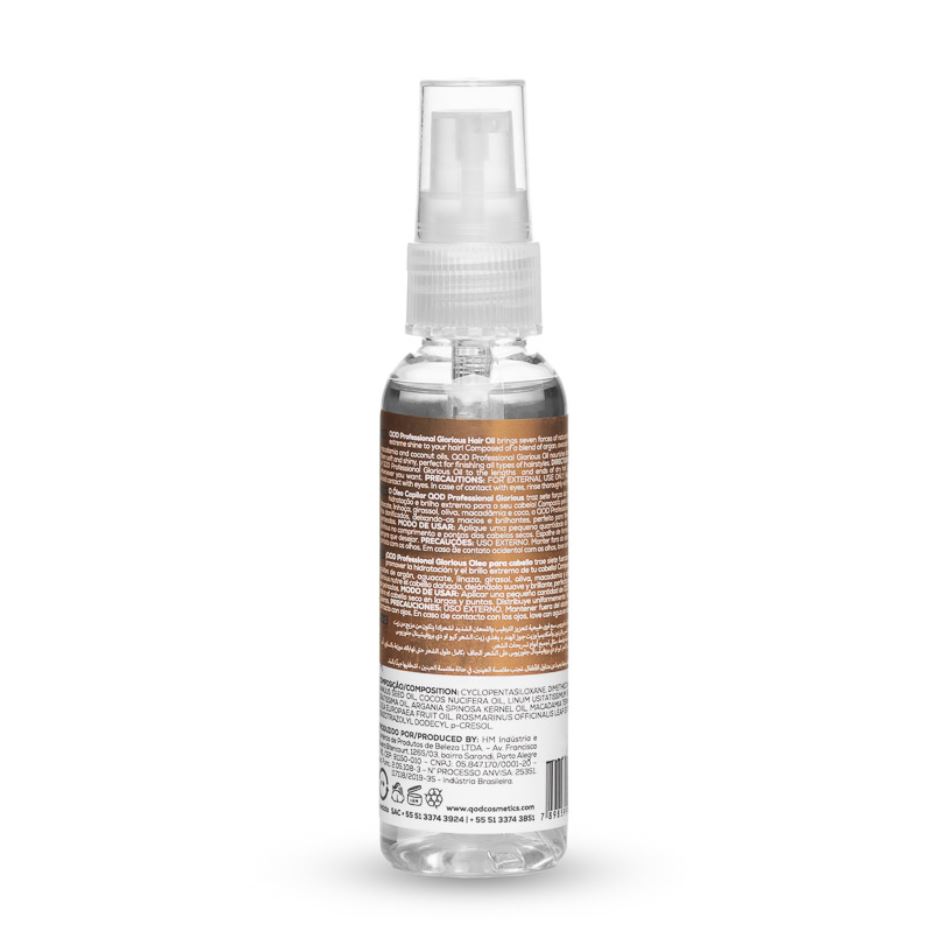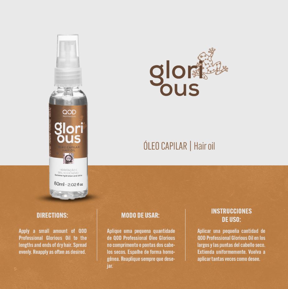 QOD PRO  Glorious Oil is the hair oil that brings the seven forces of nature to promote hydration and extreme shine for your hair! Composed of a Blend of argan, avocado, linseed, sunflower, olive, macadamia and coconut oils, QOD Professional Oil Glorious nourishes damaged strands, leaving them soft and shiny, perfect for finishing all types of hairstyles.